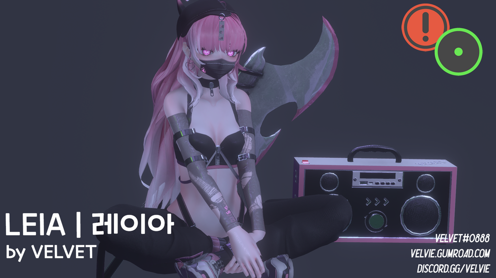 Hair hue, brightness, emission, saturation sliders; Eye hue; Outfit hue (controls all pink, including boombox!); Outfit Saturation slider; Skintone slider; Body sweat slider; Model-wide manual lighting controller (If you're too bright in a dark world you can use this)